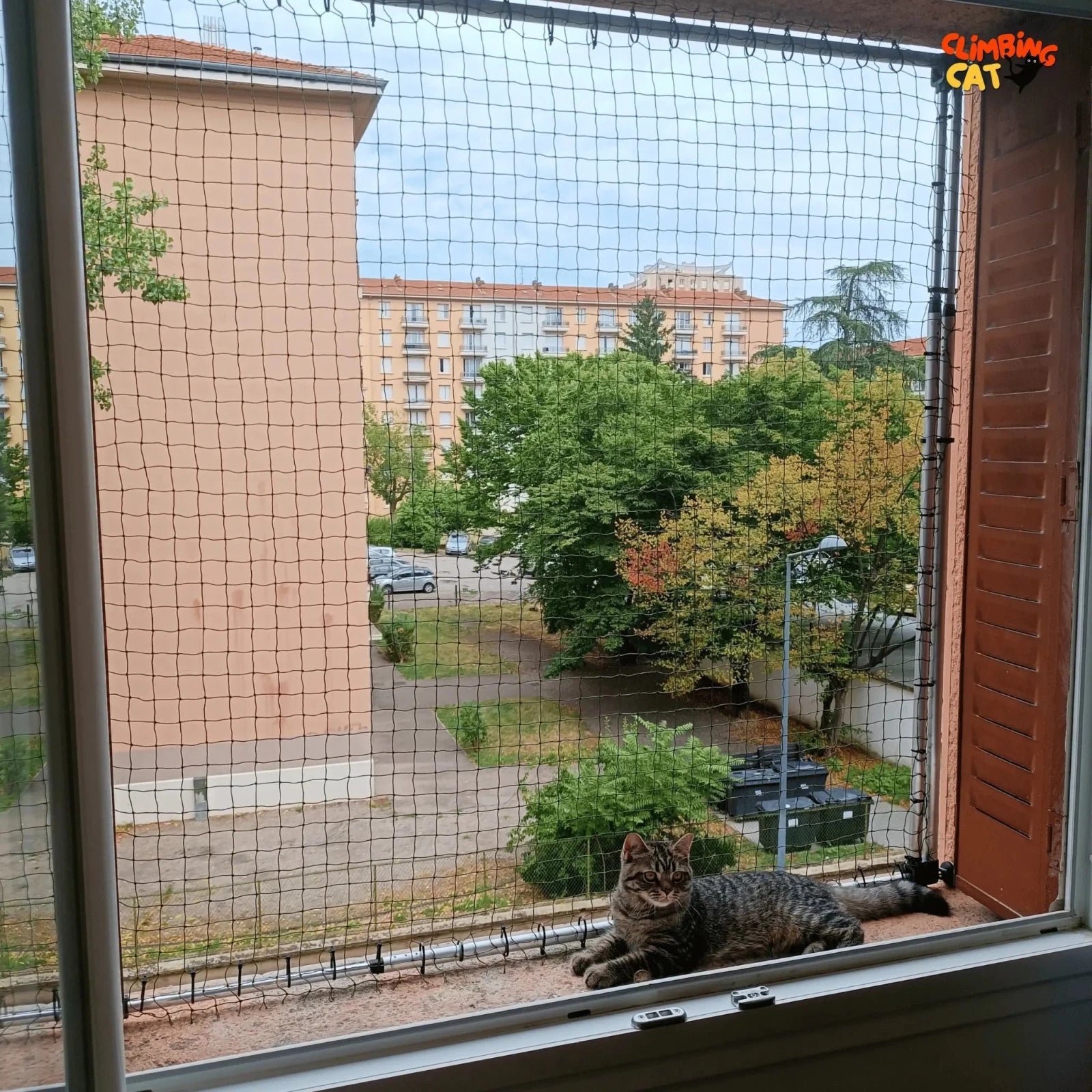 Chez Climbing Cat, nous utilisons des filets en polyéthylène vert renforcés en acier. Avec un maillage très discret de 3 cm x 3 cm, ils empêchent même les chatons de passer, tout en restant discrets grâce à leur couleur anti-reflets qui ne modifie pas la lumière naturelle.