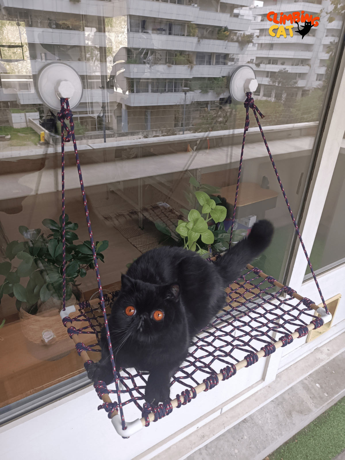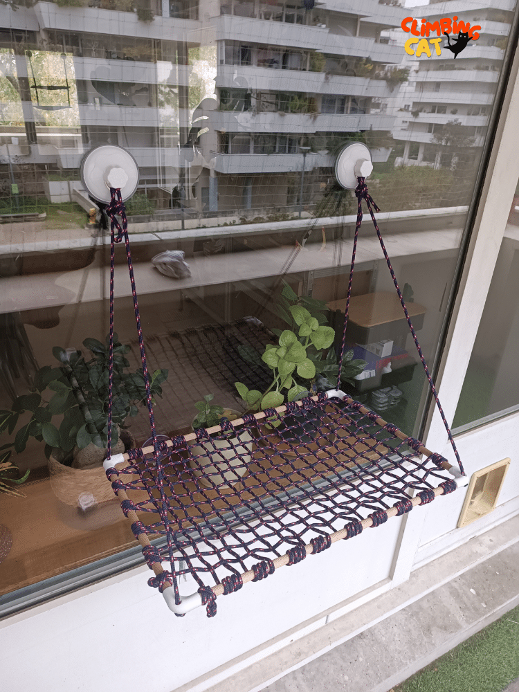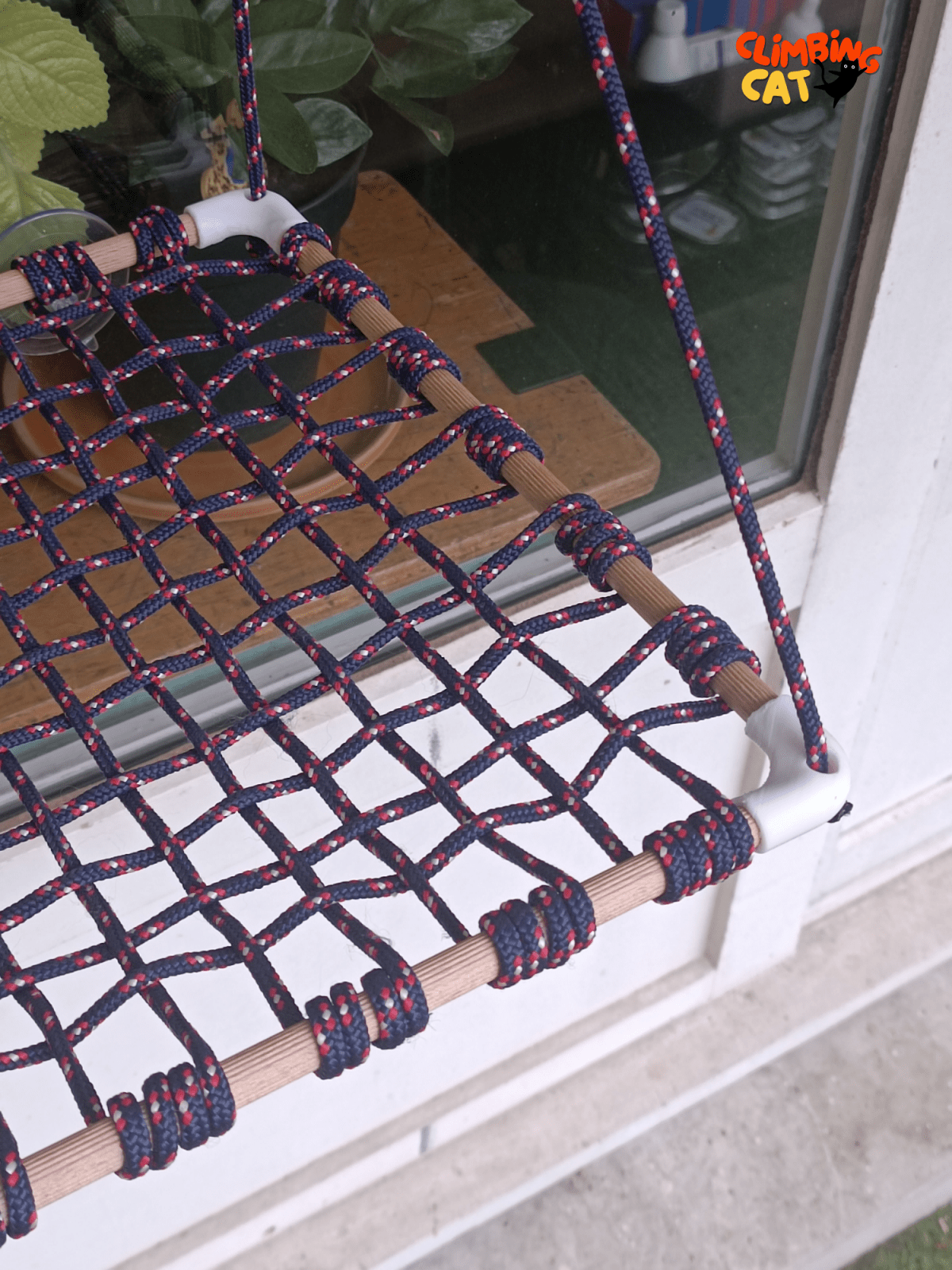 Hamac pour fenêtre en paracorde avec fixation par ventouses. Tressée à la main. Dimensions 54x38cm.